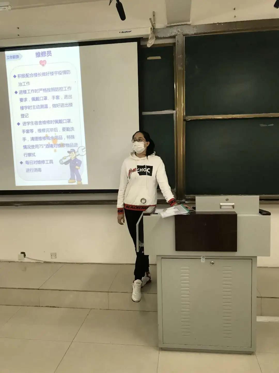 为进一步规范新冠肺炎疫情防控工作,提高公寓管理员防范和应急处置能力,切实保障全校师生的健康和生命安全,5月19日,学生工作处公寓管理科三名老师针对疫情防控以及日常检查、突发情况处理等学生公寓所涉及的各项工作为26名公寓管理员开展了业务培训,为学生返校后疫情防疫做好扎实准备。