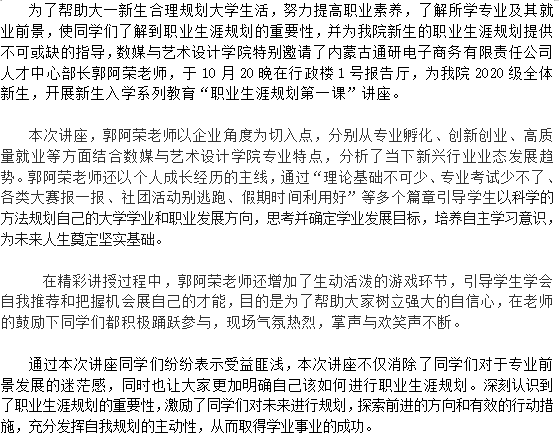数媒与艺术设计学院举办2020级新生 “职业生涯规划第一课”讲座