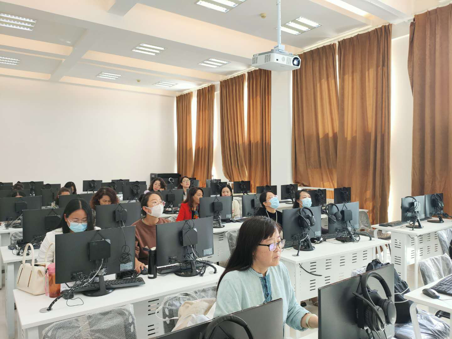 全体外语专兼职教师及外聘教师在一号语音室进行了设备使用培训,此次培训由来自外语教学与研究出版社的老师负责,就硬件设备的使用以及教学软件做了简单介绍。
