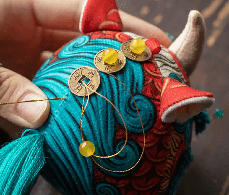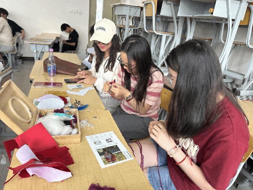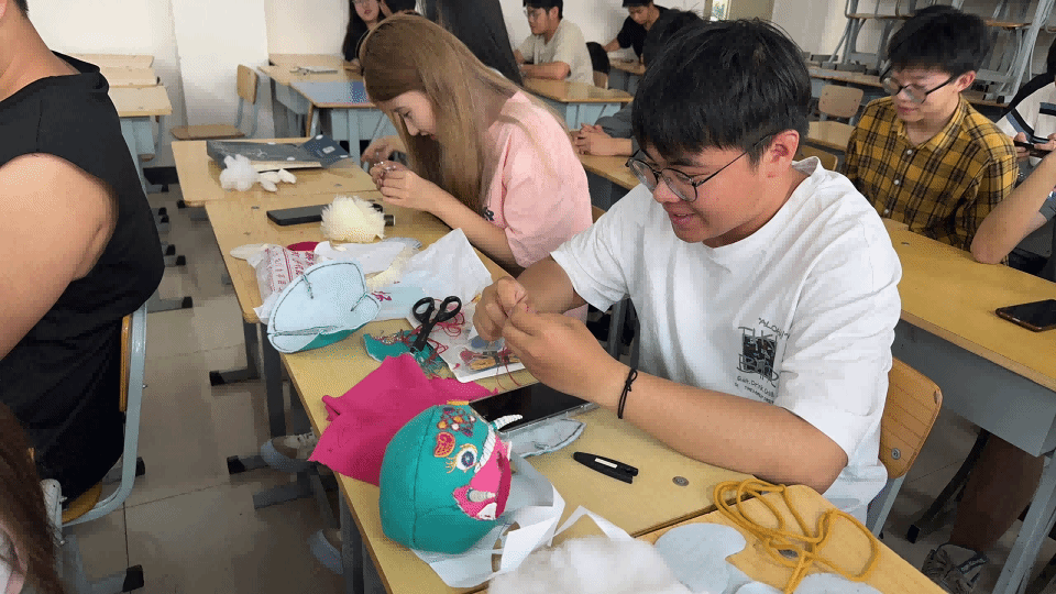 在实践教学环节,任课教师采用的材料包制作中则要求学生亲手缝制端午节布艺香包以及立体玩偶。同学们多数从未参与过缝制工艺过程,但穿针引线、集思广益间,小组成员们实现了一片布、一根针、几条线缝绣出“神兽”基础造型;再配以长效驱虫攻防五毒的艾绒,附上五彩长命缕的美学设计,大家竟然亲手做出了工序复杂、工艺精致的艺术品。