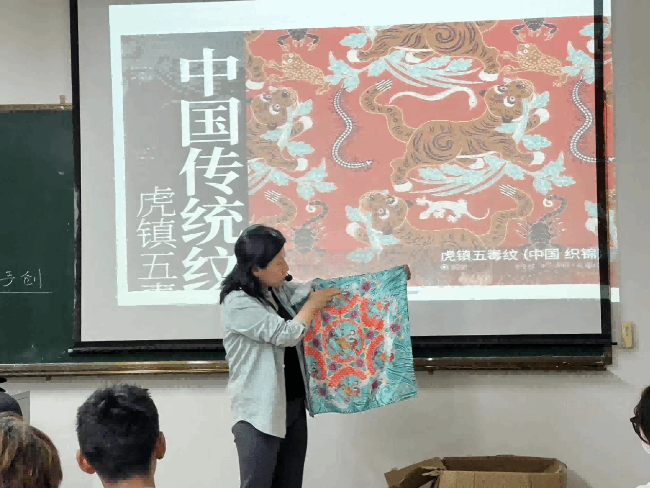 图形是最直接可以传达其中意义的符号,而中式图案设计一直遵循“图必有意,意必吉祥”的原则,因此,课程的理论教学部分,教师以赏析的方式,带学生们细化分解了端午文化中每一种图饰纹样的形式色,高度凝练了虎纹、五毒纹、貔貅、金蟾、醒狮、辰龙等中华神兽元素蕴含的平安祥瑞、诸事顺遂的美好寓意。在随后课堂讨论中,同学们更是列举了数不胜数的“神兽”文创元素,通过课程的认知体验上升了对衣、食、住、行中蕴含节日文化以及传统图案元素的全方位理解。