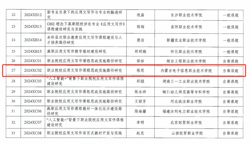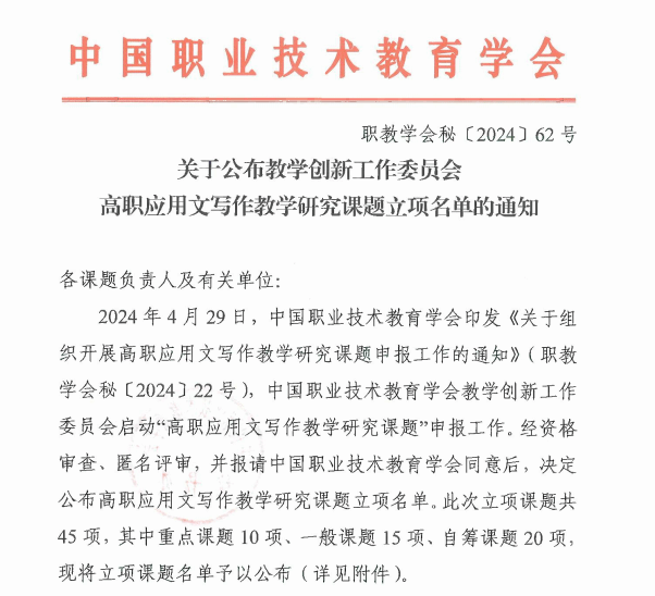 2024年8月28日,中国职业技术教育学会公布教学创新工作委员会高职应用文写作教学研究课题的立项结果,由通识教育教学部陈思老师申报的《职业院校应用文写作课程思政实施路径研究》课题喜获立项,是内蒙古职业院校中唯一获得立项的课题。