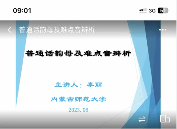 李丽老师从普通话韵母类型、普通话韵母发音要领、普通话韵母难点音辨析、普通话韵母实操训练四个方面为参训学员进行讲解,着重讲解了单韵母、复韵母和鼻韵母的发音部位、发音方法,还借助具体事例重点分析了前后鼻韵母发音的区分方法,为参训学员学习普通话韵母发音提供了指导。各盟市参训学员集中收看了线上直播。