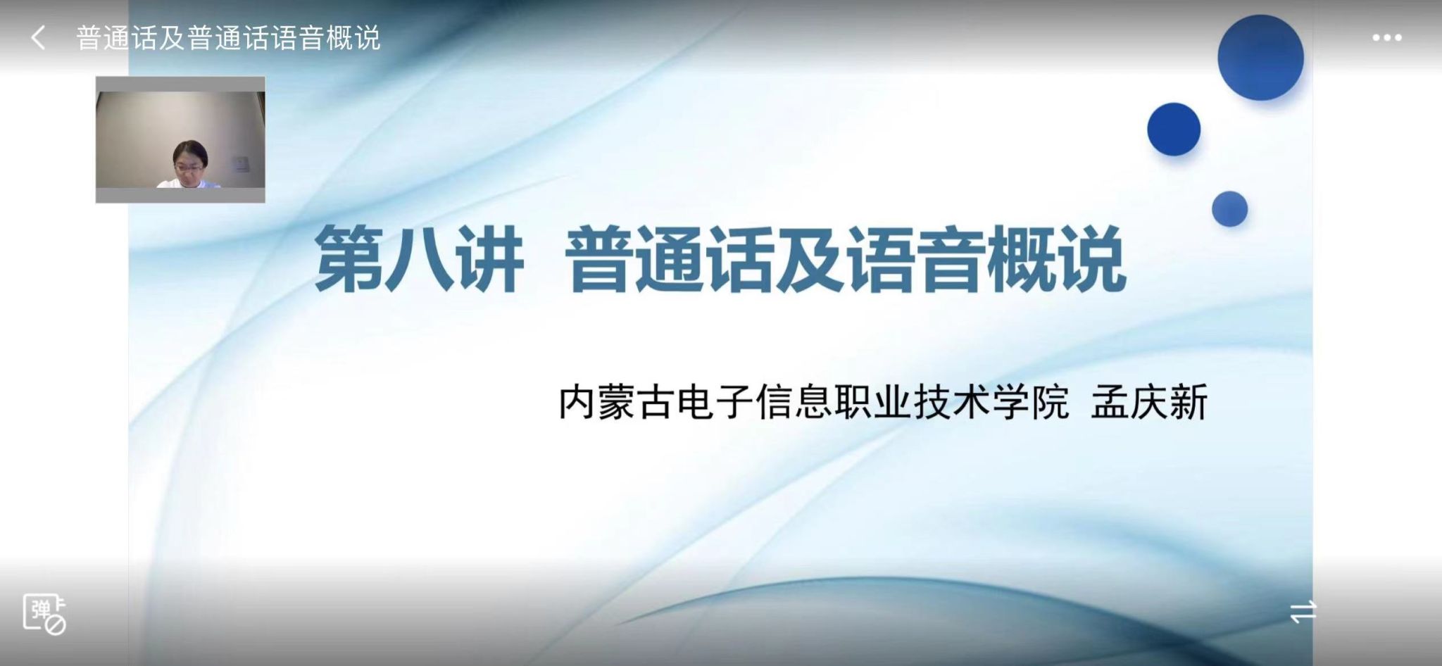 孟庆新老师从普通话的含义、普通话的语音特征、普通话朗读作品语音规范、人名与地名语音规范四个方面进行了讲解,重点从语音的基本概念、普通话语系的特点和普通话的语音特点三个方面讲解了普通话的语音特征,并用朗读作品和现实生活中的实例进行了语音规范分析。各盟市参训学员集中收看了线上直播。
