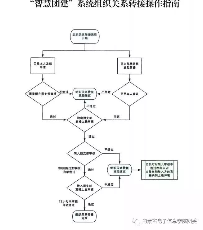 二、转入团支部必须在30个自然日内 (含30日) 完成组织关系转接的审核工作,超时“智慧团建”系统将默认为转入团支部同意接收并自动审核通过;转入团支部的上级团委人必须在72个小时内完成接收审核,超时“智慧团建” 系统将默认为上级团委同意接收该团员并目动审核通过;团员教育、管理和监督责任由转入团支部及其上级团委承担。