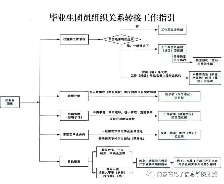 一、已落实工作单位的高校(含高职,下同)毕业生团员:应将团组织关系转接到工作单位团组织;工作单位尚未建立团组织的,应转接到工作单位所在地的乡镇(街道)的村(社区)团组织;特殊情况下无法确定应转入团支部的,可转接到工作单位所在乡镇街道“流动团员团支部”;在国(境)外工作,工作(派遣)单位在境内无常设机构的,应转接到本人户籍所在地(家庭所在地)村(社区)团组织。