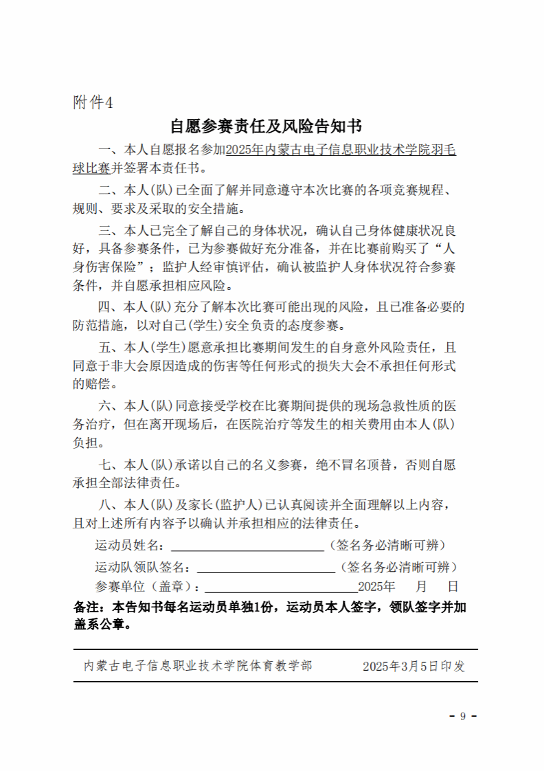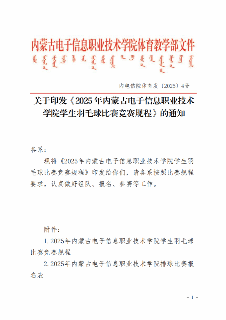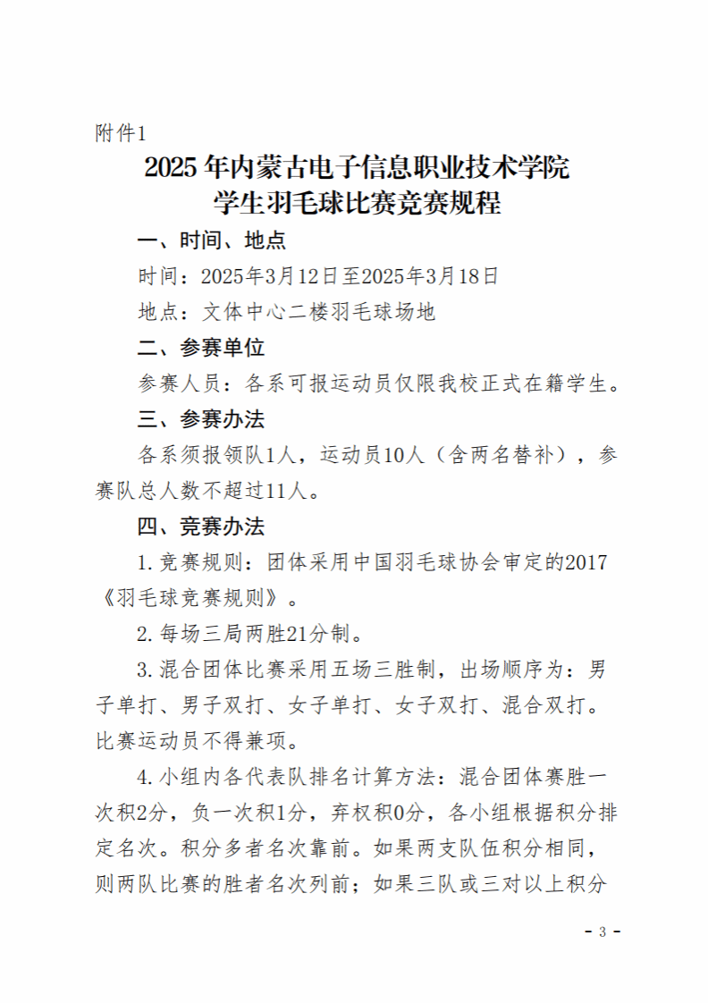 关于印发《2025年内蒙古电子信息职业技术学院学生羽毛球比赛竞赛规程》的通知