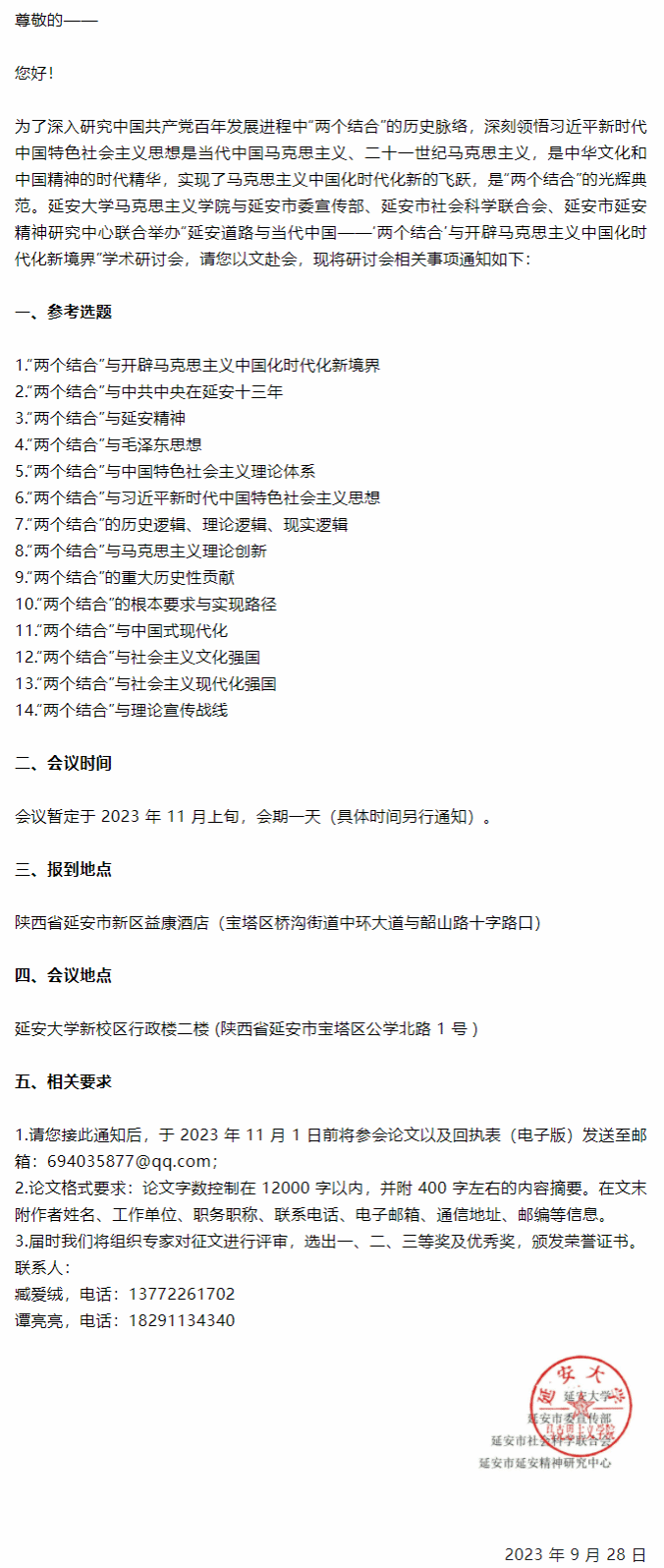 【征文】“延安道路与当代中国——‘两个结合’与开辟马克思主义中国化时代化新境界”学术研讨会