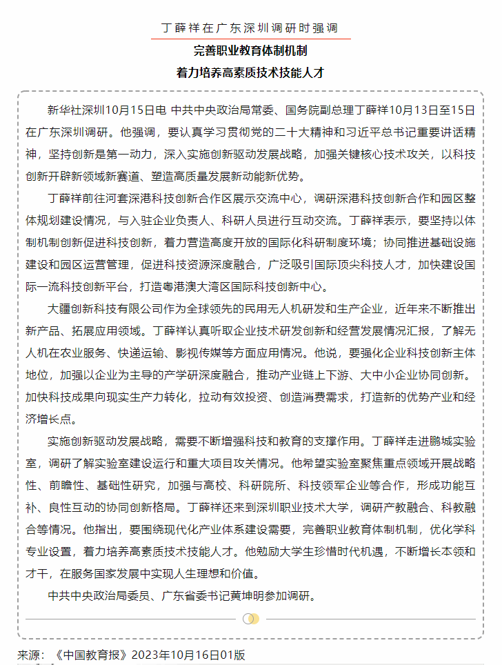 丁薛祥:完善职业教育体制机制 着力培养高素质技术技能人才