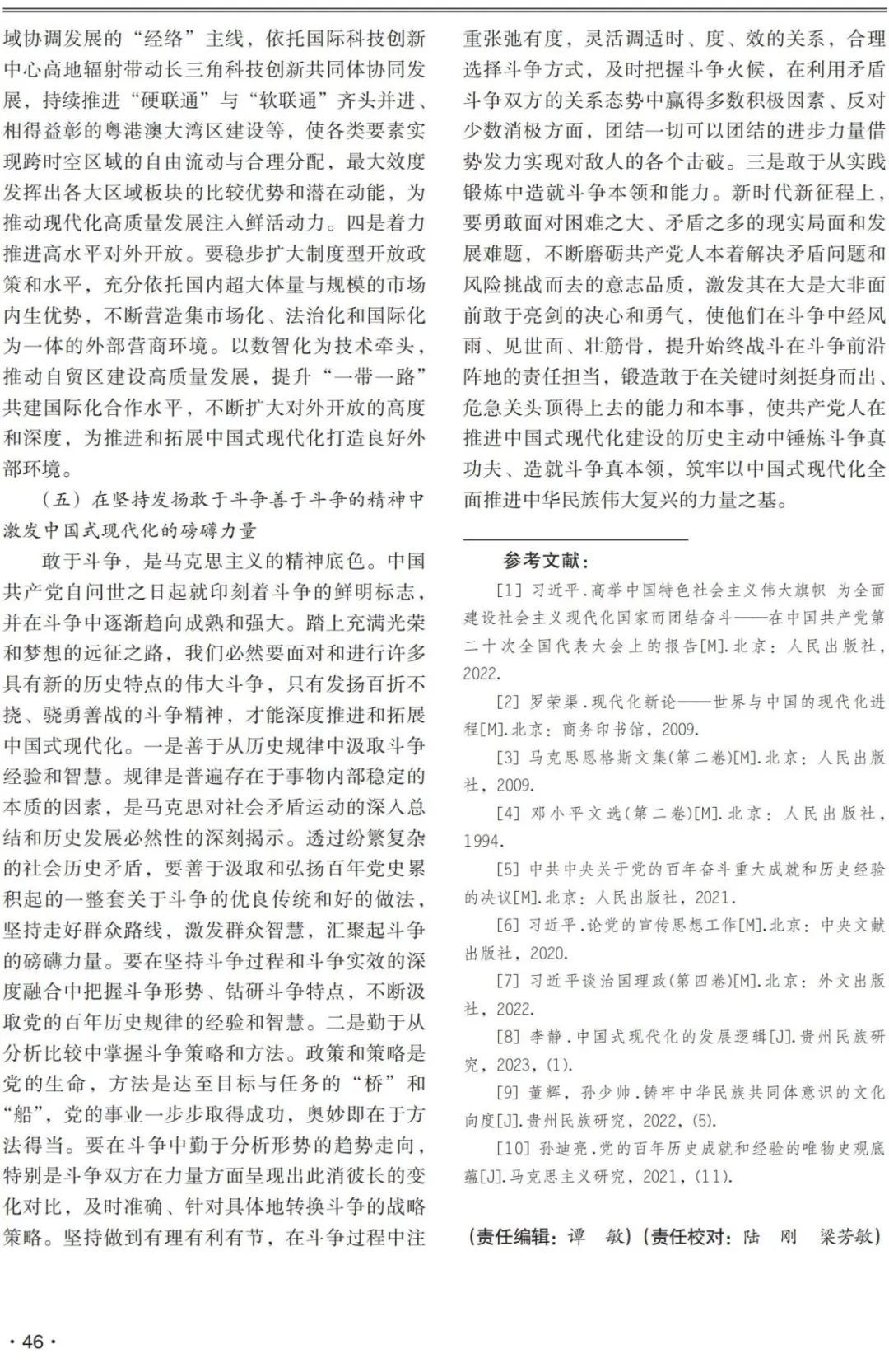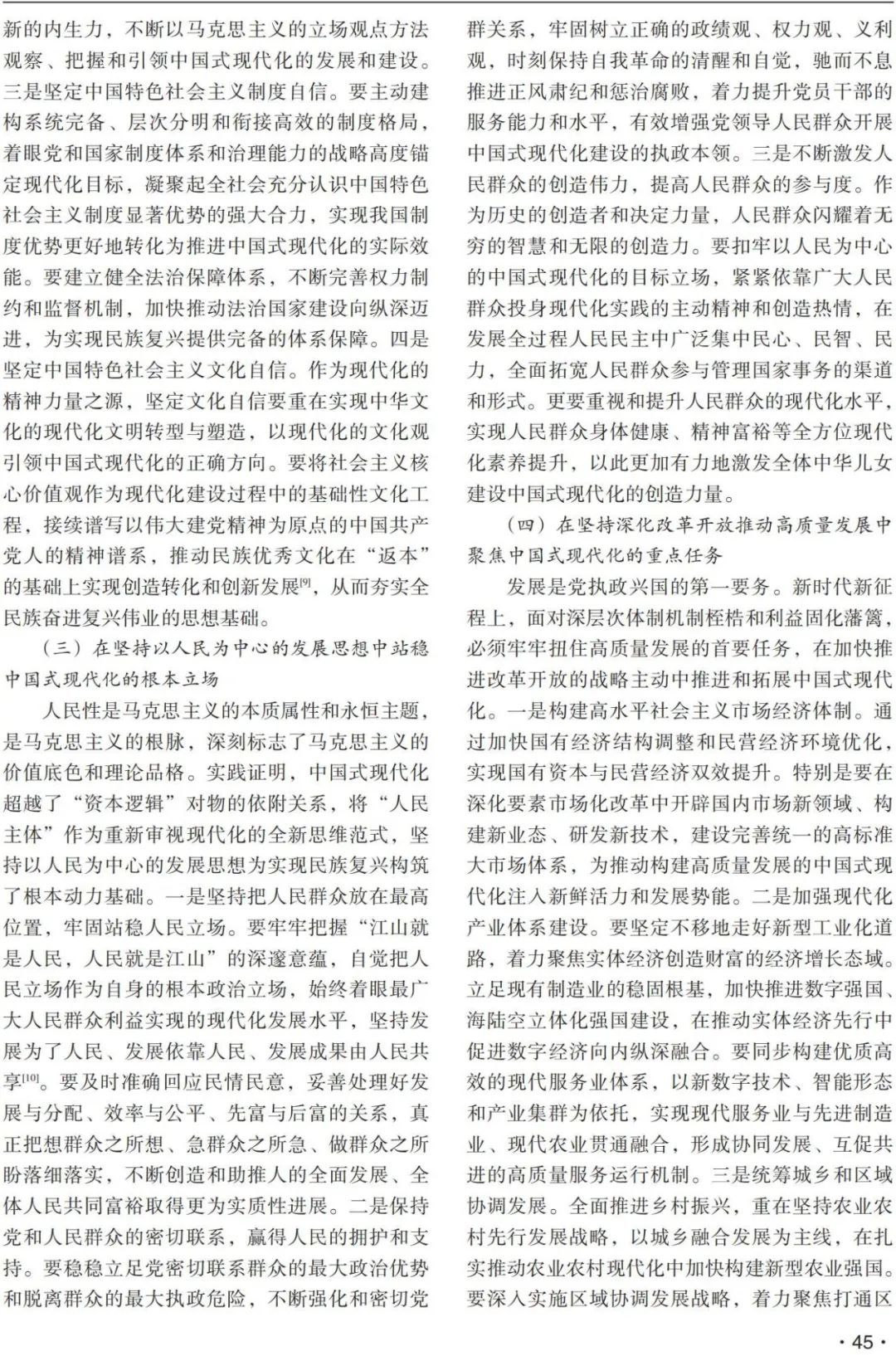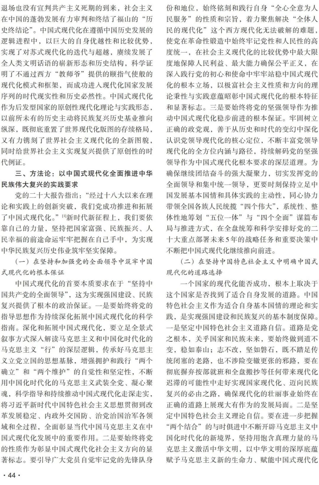 荣富强提供了根本遵循,还为后发国家迈向现代化提供了中国方案,同时为世界社会主义实现复兴作出了原创性时代例证;从方法论角度看,要以党的领导为根本保证,以中国特色社会主义为道路选择,坚持以人民为中心的根本立场,聚焦深化改革开放推动高质量发展的重点任务,激发敢于斗争善于斗争的精神力量,从而筑牢以中国式现代化全面推进中