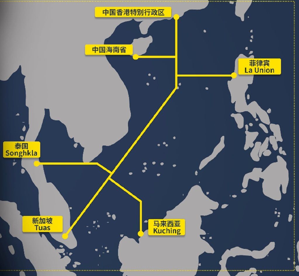 地球约有71%的面积被海洋所占据。实现大陆间的通信连接最好的方式就是铺设海底光缆。为提高国际通信基础设施互联互通水平,满足亚太地区日益增长的国际带宽需求,中国电信主导发起亚洲直达(ADC)国际海缆建设,该工程全长约9600公里。中国联通国际有限公司(CUG)参与发起SEA-H2X海缆计划,全长将达到5,000公里。图为SEA-H2X海缆计划联通区域