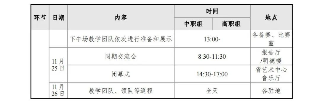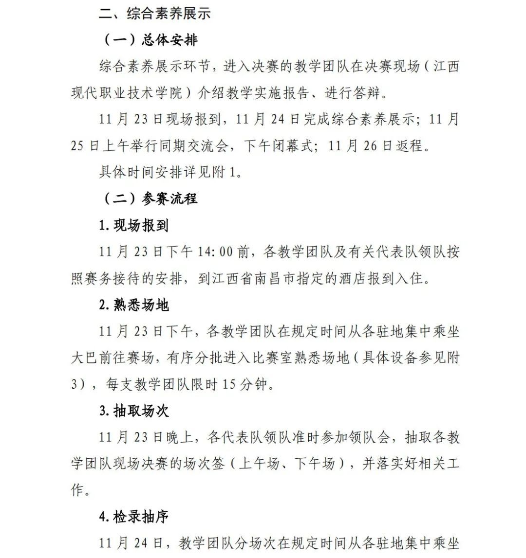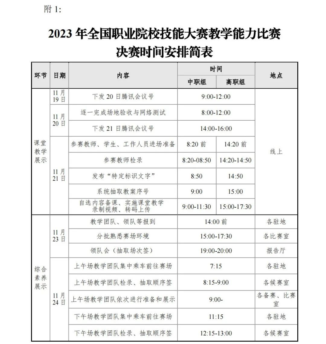 课堂教学展示时间:2023年11月21日,上午中职组比赛、下午高职组(含职教本科)比赛。综合素养展示时间:2023年11月24日,中、高职组同时进行。