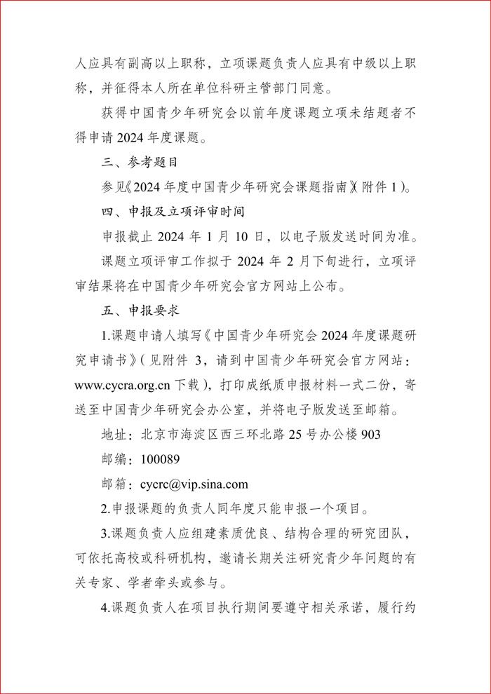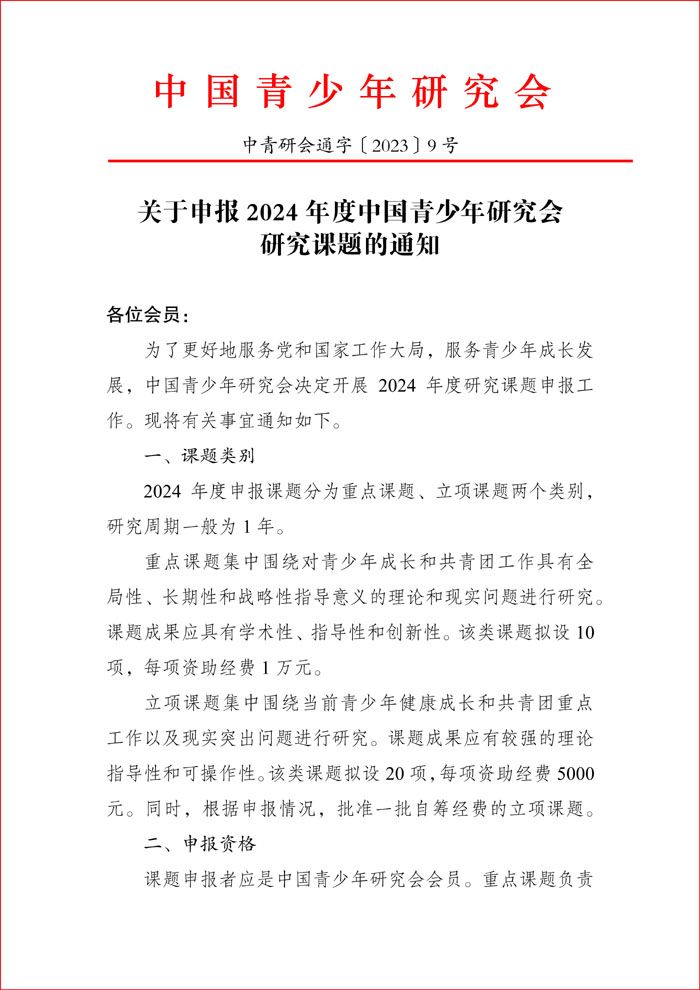 附件2.中国青少年研究会课题管理办法.pdf 附件1.2024年度中国青少年研究会课题指南.pdf 附件3.中国青少年研究会 2024 年度课题研究申请书.doc 青研会2024课题通知.pdf 附件3.中国青少年研究会 2024 年度课题研究申请书.pdf