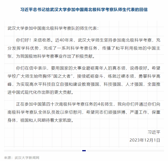 习近平总书记给武汉大学参加中国南北极科学考察队师生代表的回信