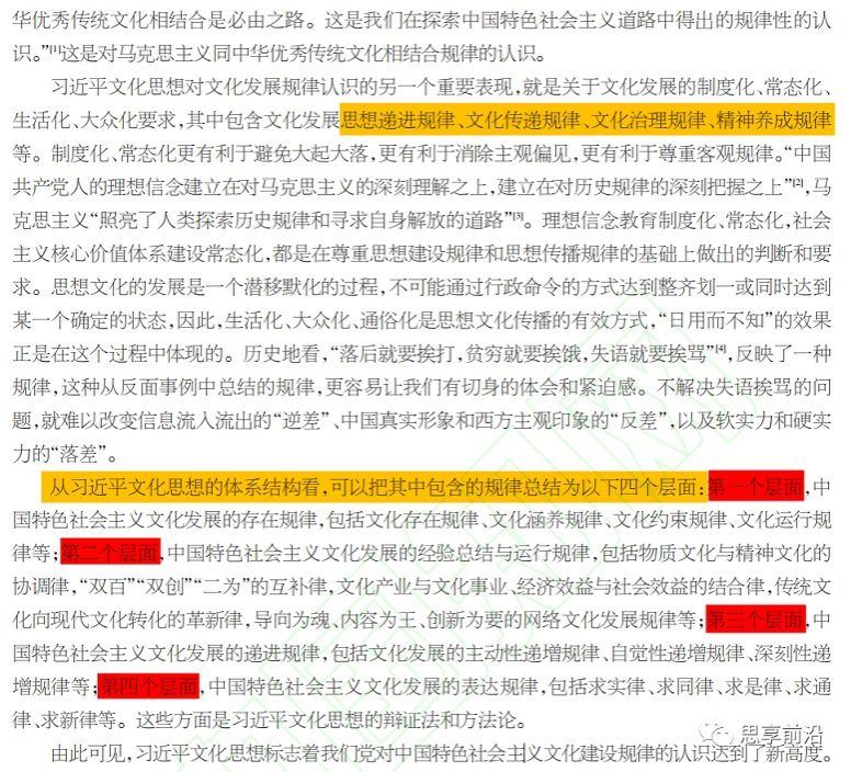第二个层面,中国特色社会主义文化发展的经验总结与运行规律,包括物质文化与精神文化的协调律,“双百”“双创”“二为”的互补律,文化产业与文化事业、经济效益与社会效益的结合律,传统文化向现代文化转化的革新律,导向为魂、内容为王、创新为要的网络文化发展规律等;