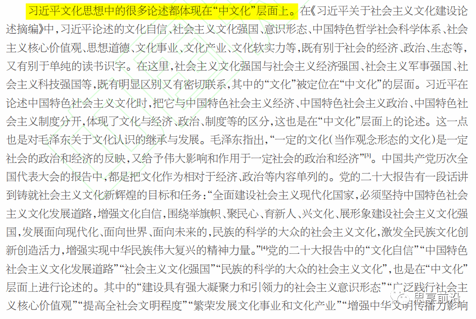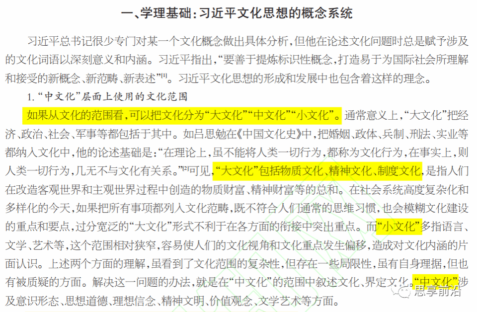 如果从文化的范围看,可以把文化分为“大文化”“中文化”“小文化”。习近平文化思想中的很多论述都体现在“中文化”层面上。