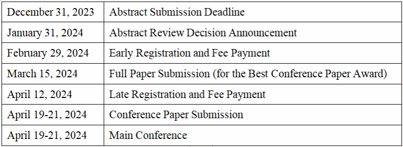 (Note: At least one author of the accepted paper has to register and pay the registration fee by February 29, 2024, in order for the paper to be included the conference program.)