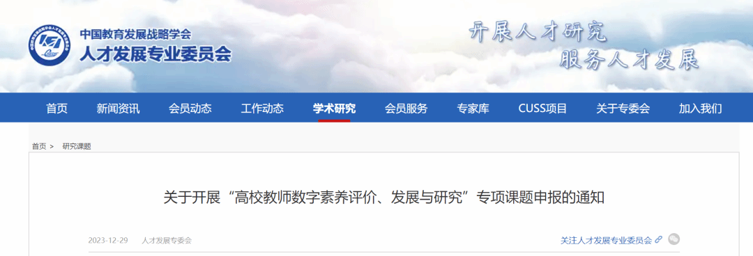 为深入贯彻落实党的二十大精神,扎实推进国家教育数字化战略行动,完善教育信息化标准体系,提升教师利用数字技术优化、创新和变革教育教学活动的意识、能力和责任,推动以教师评价改革牵引育人方式改革,中国教育发展战略学会人才发展专业委员会与北京外研在线数字科技有限公司联合设立“高校教师数字素养评价、发展与研究”专项课题,现发布课题指南和申报通知。