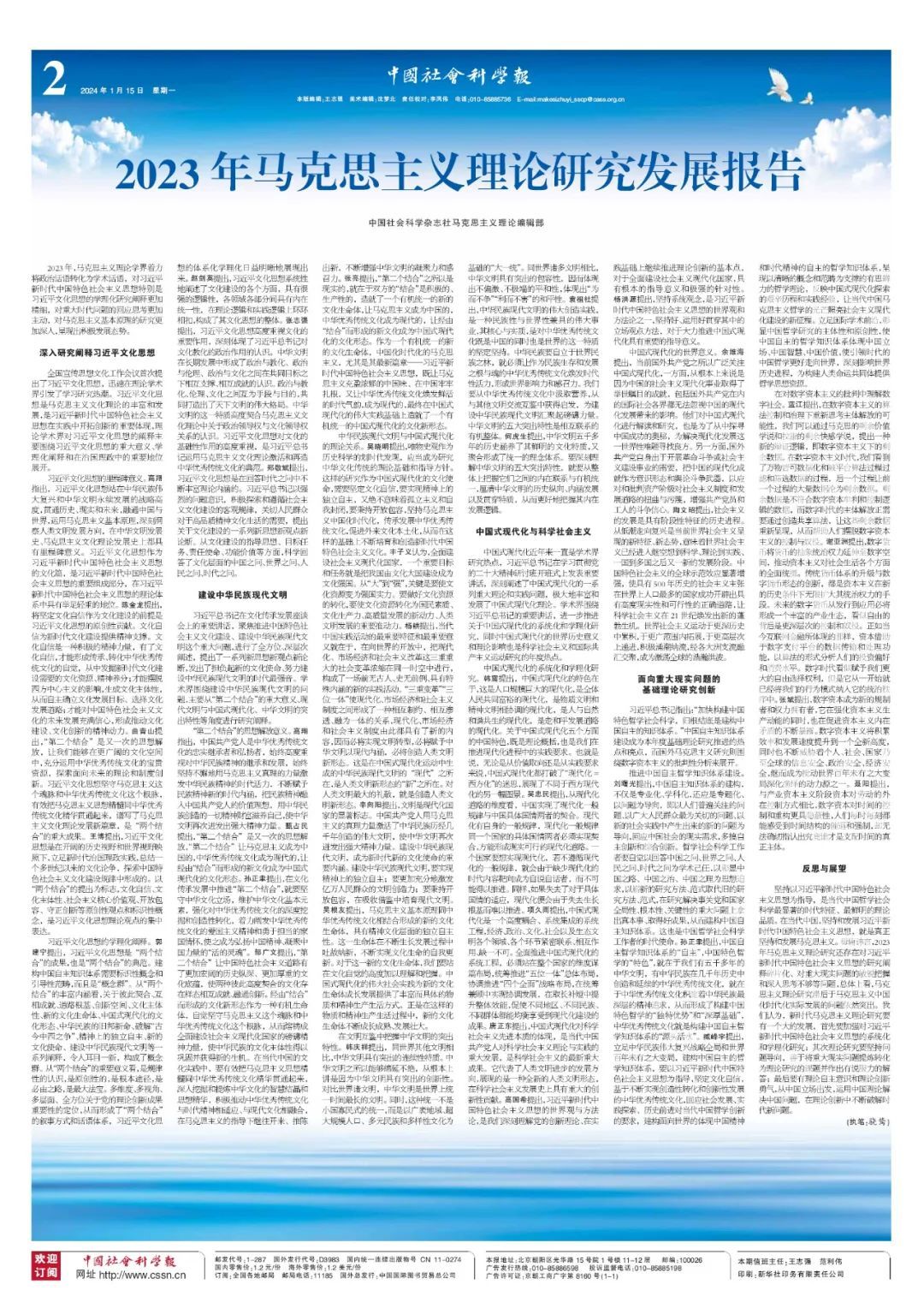 2023年,马克思主义理论学界着力将政治话语转化为学术话语,对习近平新时代中国特色社会主义思想特别是习近平文化思想的学理化研究阐释更加精细,对重大时代问题的回应思考更加主动,对马克思主义基本原理的研究更加深入,呈现出积极发展态势。