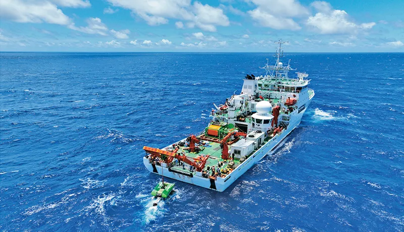 近期,我国深海矿产资源开发关键技术研究与装备研制取得重大突破,由上海交通大学自主研制的深海重载作业采矿车工程样机“开拓二号”成功完成海试。图为2024年6月22日拍摄的“开拓二号”海试现场(无人机照片)。 新华社发 上海交通大学供图