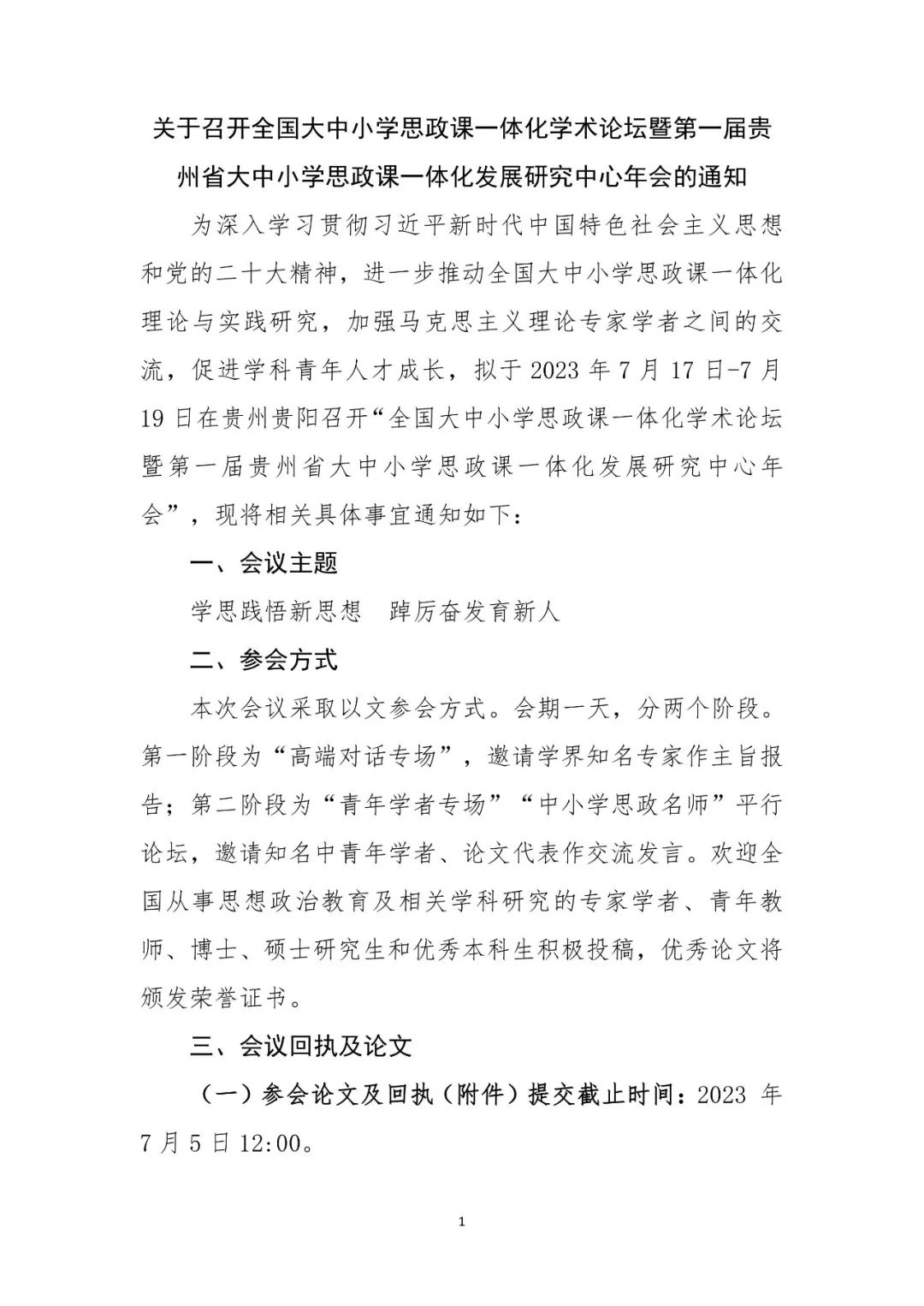 会议通知 | 全国大中小学思政课一体化学术论坛暨第一届贵州省大中小学思政课一体化发展研究中心年会通知