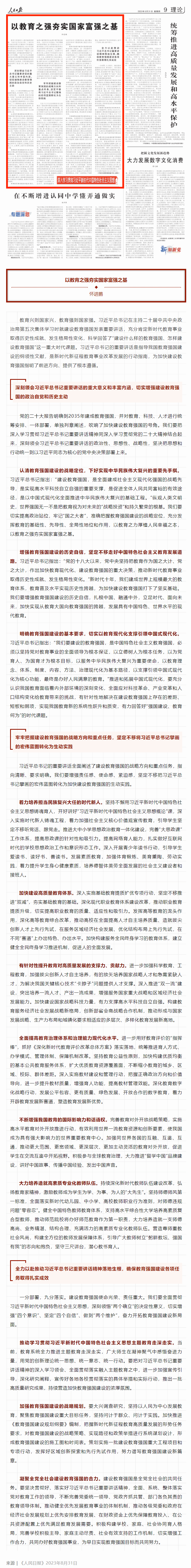 教育部党组书记、部长怀进鹏《人民日报》撰文:以教育之强夯实国家富强之基